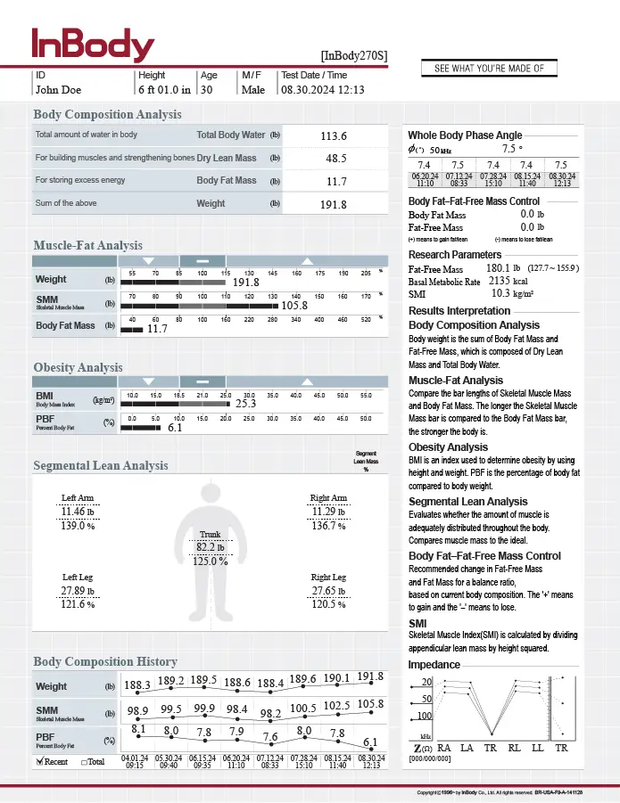 Identify muscle or fat imbalances with the Segmental Lean and Fat Analysis section. Utilize the Body Fat—Fat-Free Mass Control to provide a baseline for goal setting.